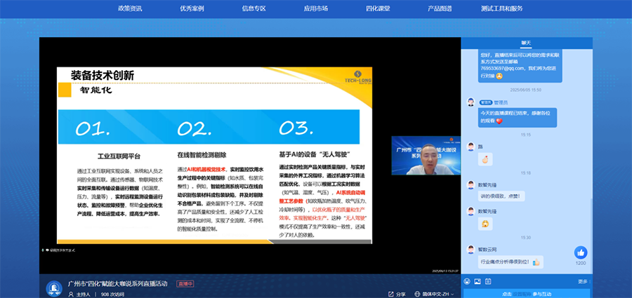 ????2025年6月19日,在廣州市工業(yè)和信息化局的精心指導(dǎo)下,廣州市“四化”賦能大咖說(shuō)系列直播第二期圓滿舉辦。本次活動(dòng)聚焦制造業(yè)數(shù)字化、網(wǎng)絡(luò)化、智能化、綠色化轉(zhuǎn)型路徑探索,作為行業(yè)轉(zhuǎn)型標(biāo)桿企業(yè),達(dá)意隆受市工信局邀請(qǐng),由公司監(jiān)事、企劃部副總監(jiān)兼高級(jí)工程師梁殿勝代表出席,圍繞包裝裝備與食品行業(yè)實(shí)戰(zhàn)經(jīng)驗(yàn),介紹并分享數(shù)字化智能化經(jīng)驗(yàn),與行業(yè)同仁共話“四化”轉(zhuǎn)型新未來(lái)。